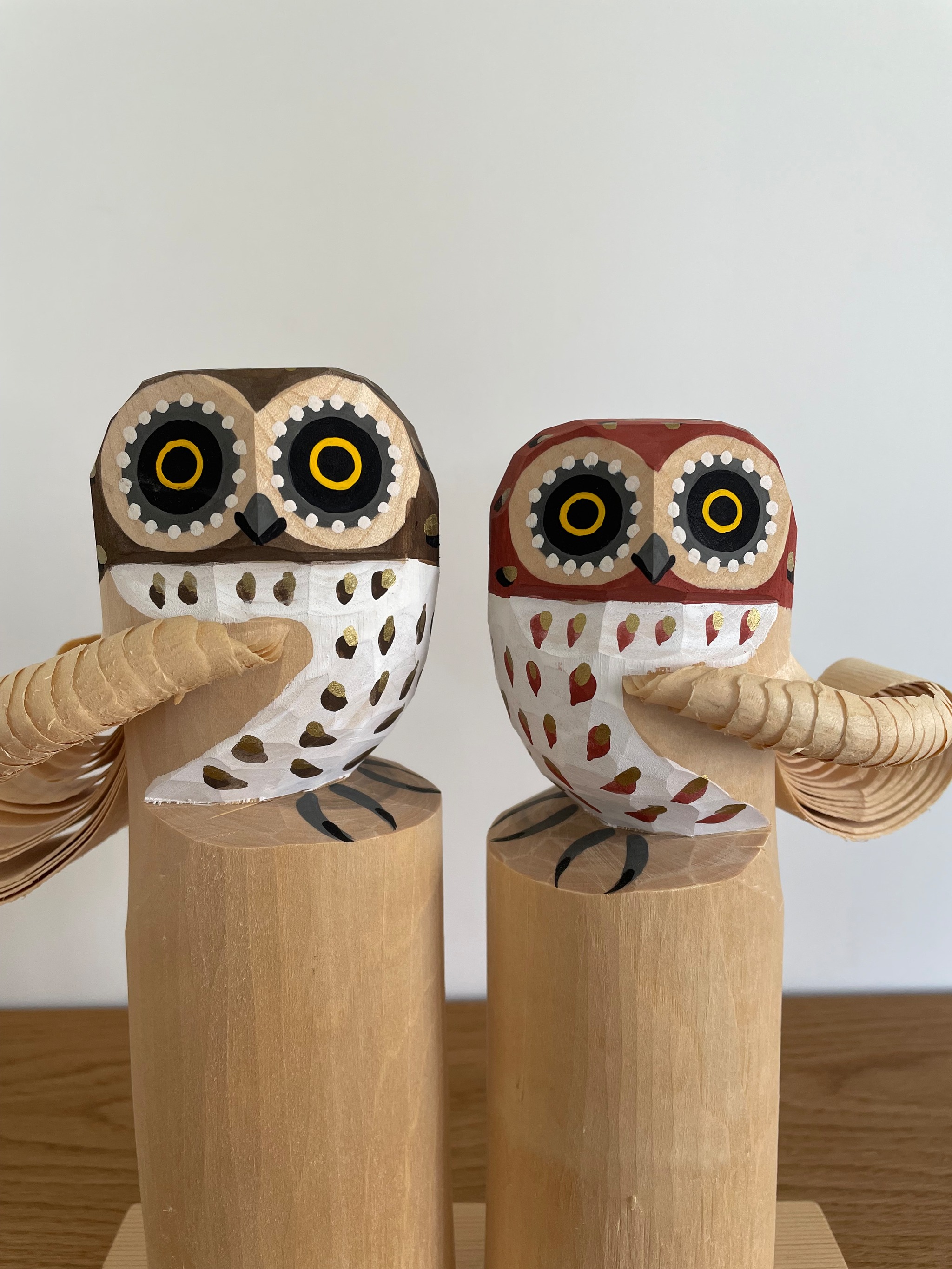 新しいネコ柄のポーチ、木彫りのフクロウの置物など、