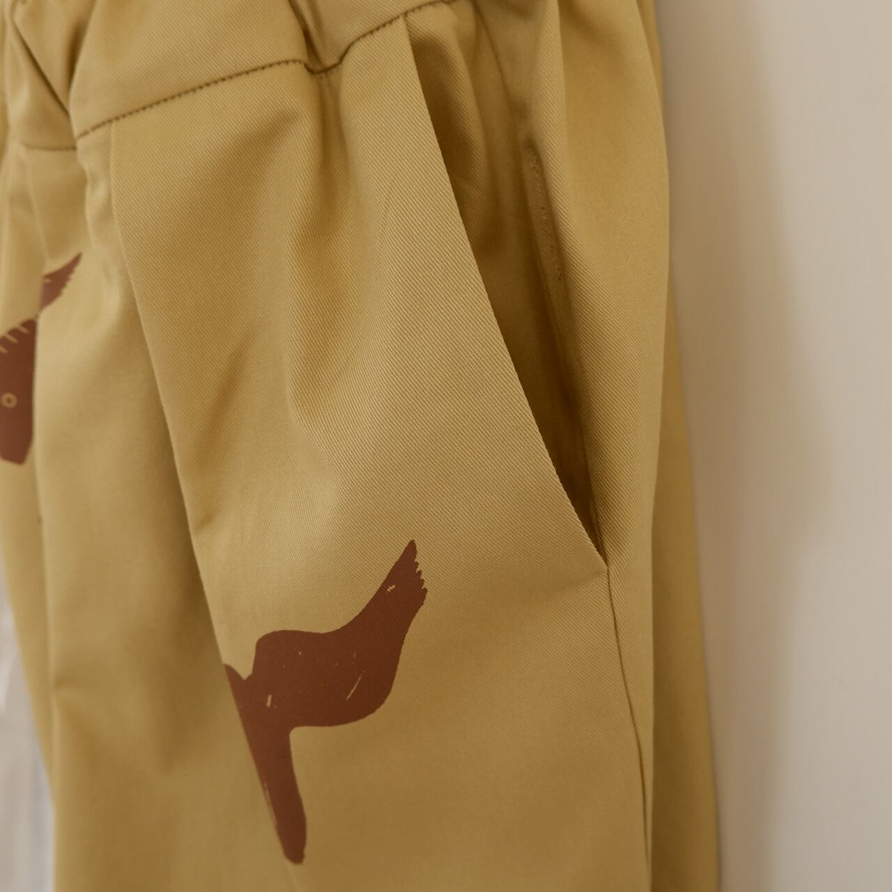 黄色+ベージューのような生地に茶色い馬をプリントしています。