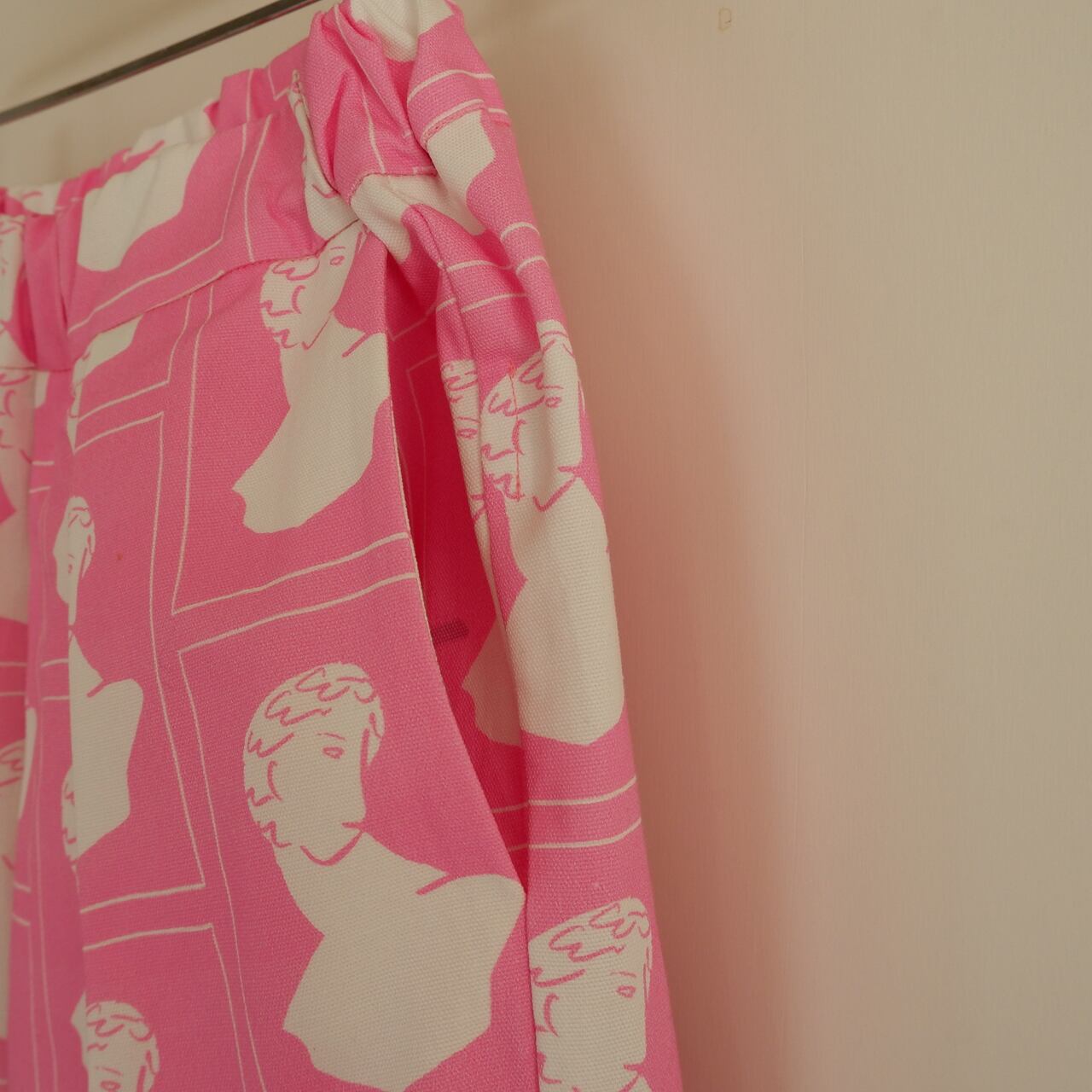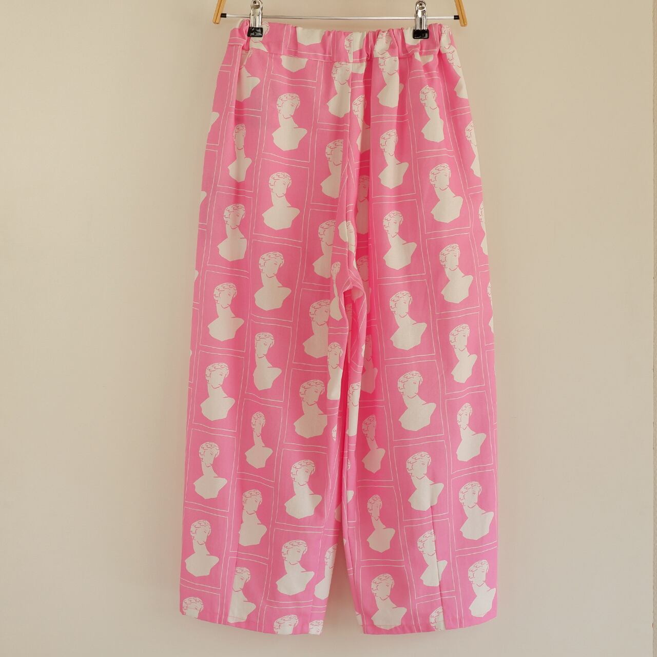 明るいピンク色の背景にアートなモチーフの石膏像。
